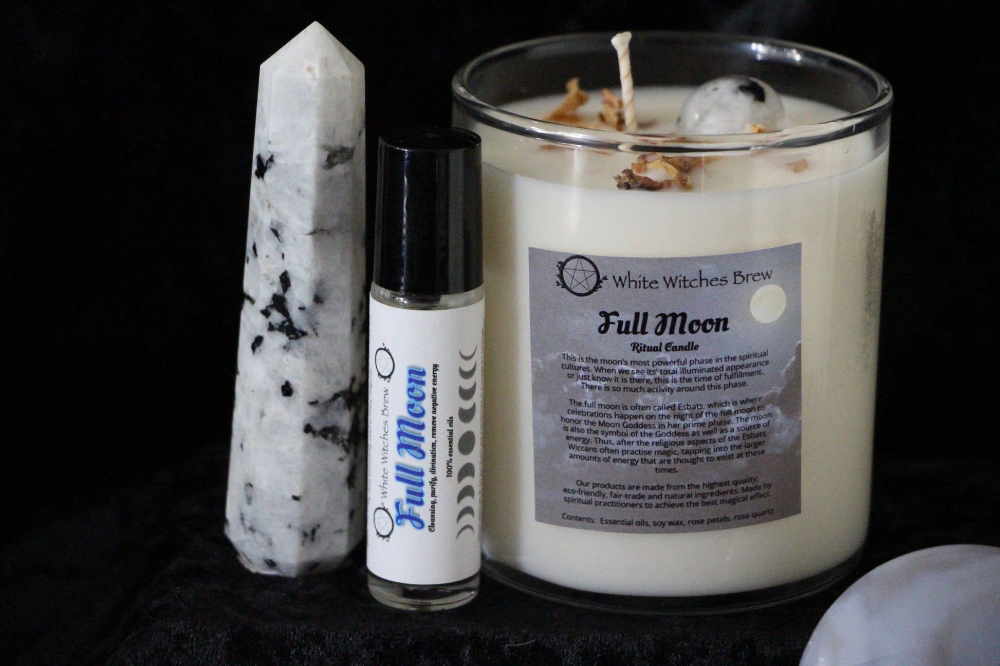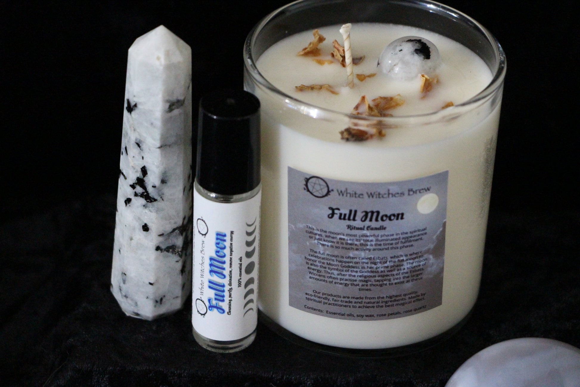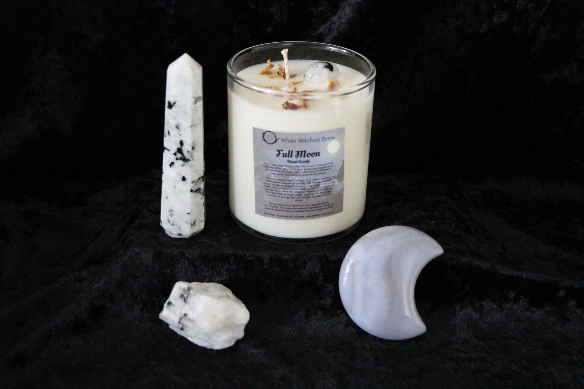 Bathed in the glow of the full moon, our Full Moon Ritual Candle is a sacred tool for release, reflection, and emotional renewal. Hand-poured with intention and infused with rose petals and Rainbow Moonstone inside, this candle is perfect for lunar rituals, heart healing, and manifesting love in all its forms.