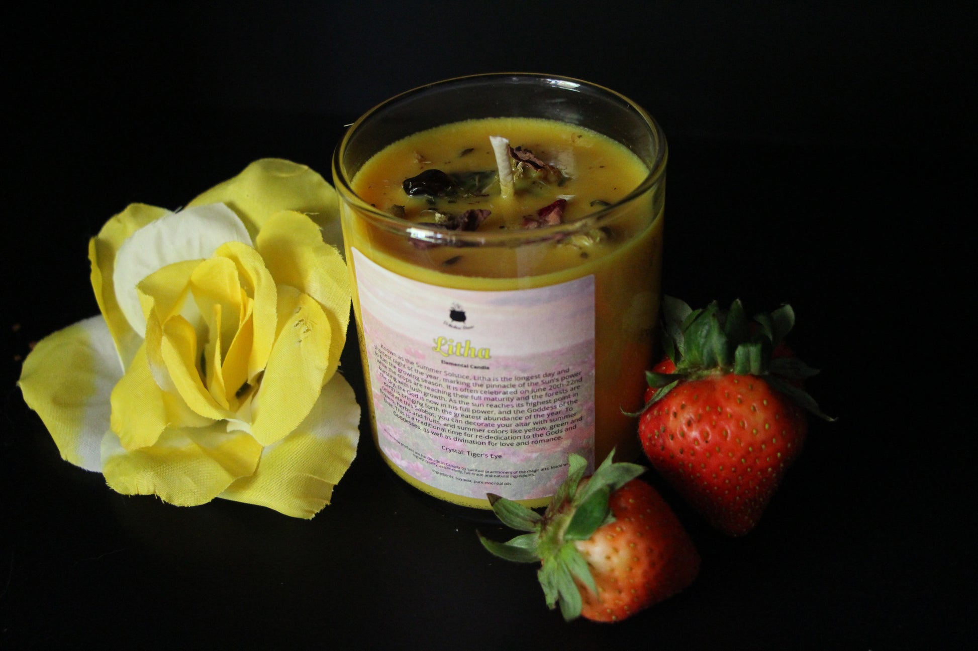 Topped with a radiant mix of rose, lavender, chamomile, and St. John’s Wort, this candle honors the energy of Litha — the Summer Solstice — a time of strength, abundance, and spiritual illumination.
