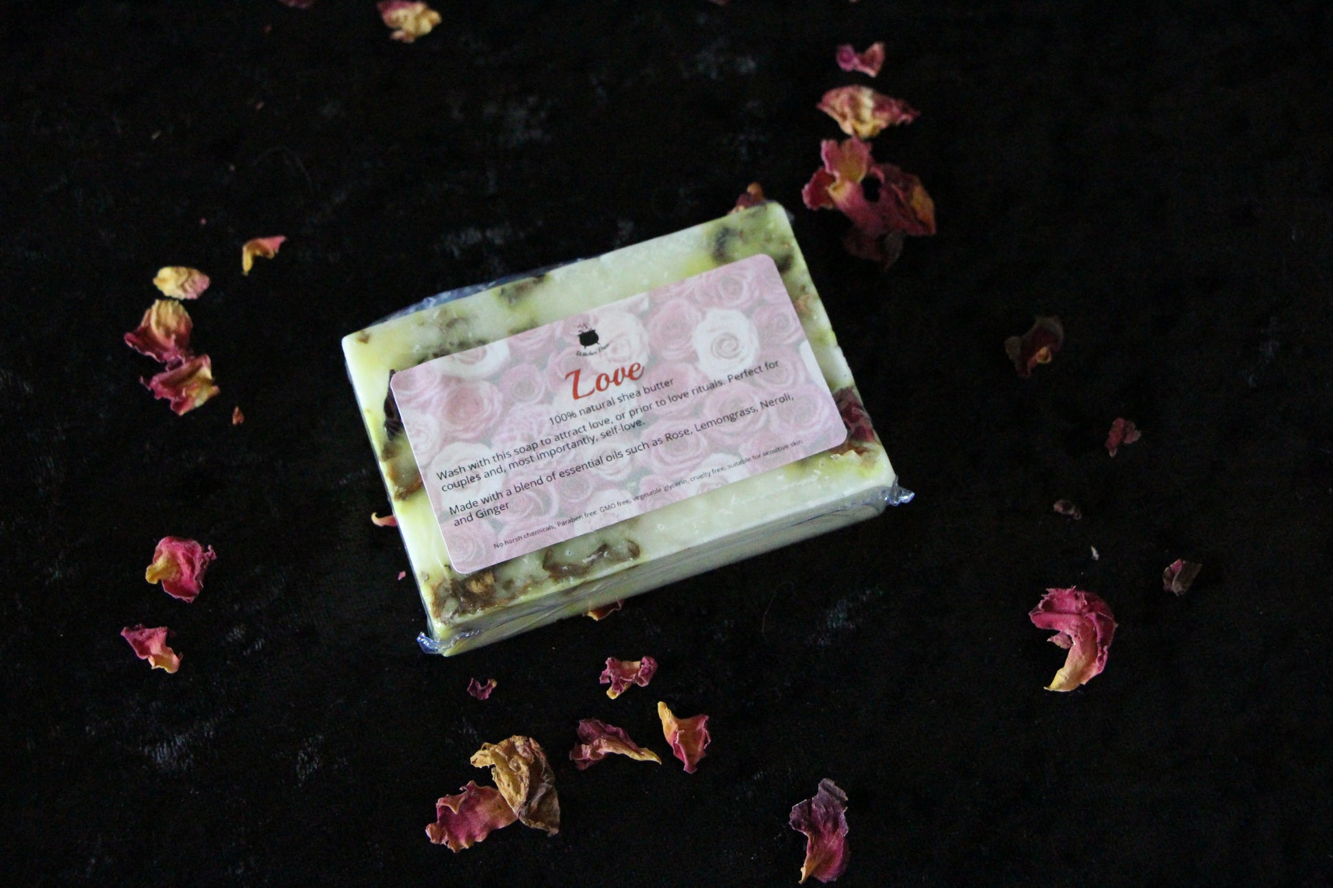 Handcrafted with nourishing shea butter and a sensual blend of essential oils, our Love Soap is made to soften the skin and awaken the heart. Infused with dried rose petals and energetically aligned to promote self-love, compassion, and attraction, this bar brings a touch of magic to your daily cleansing rituals.