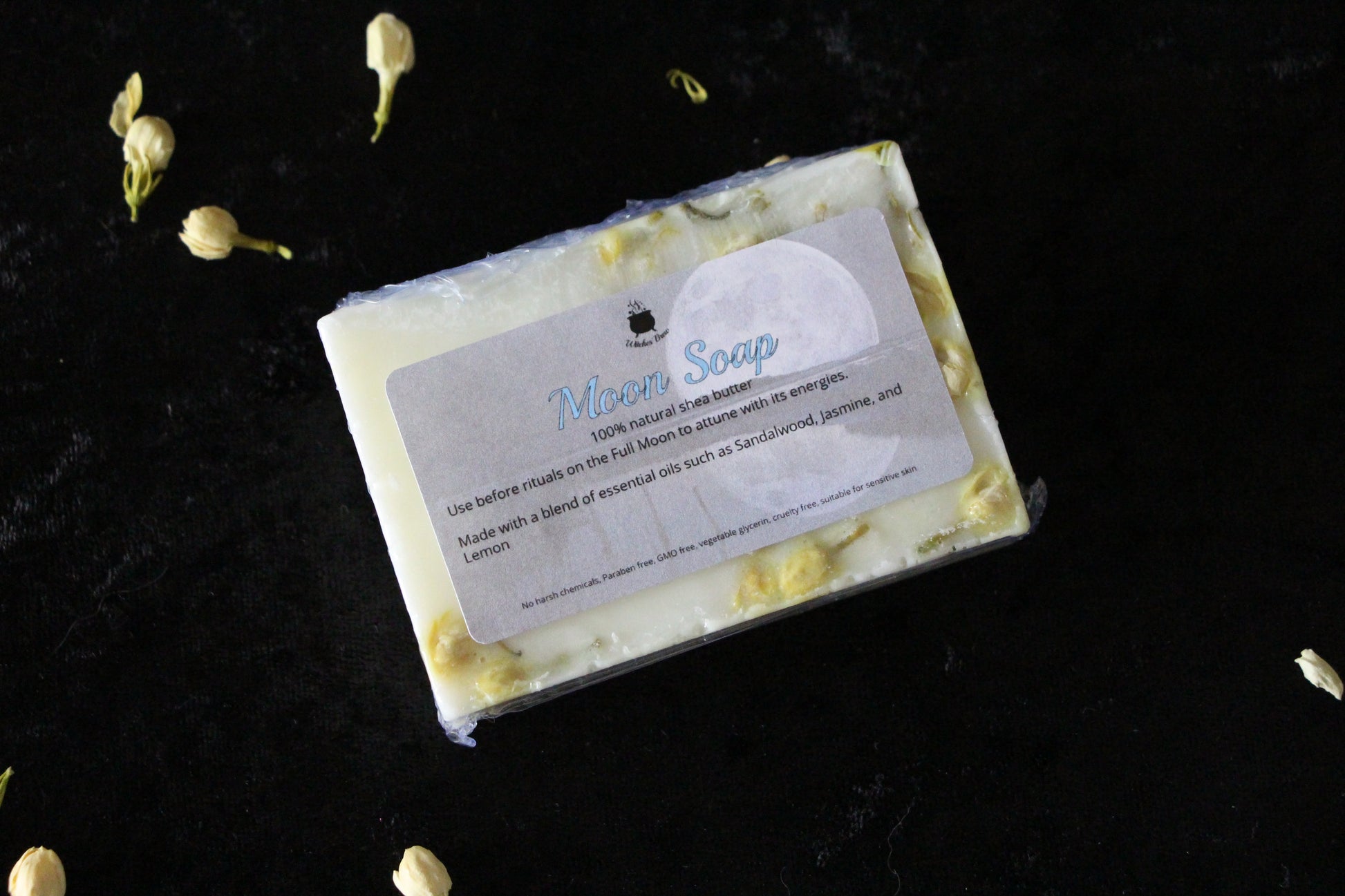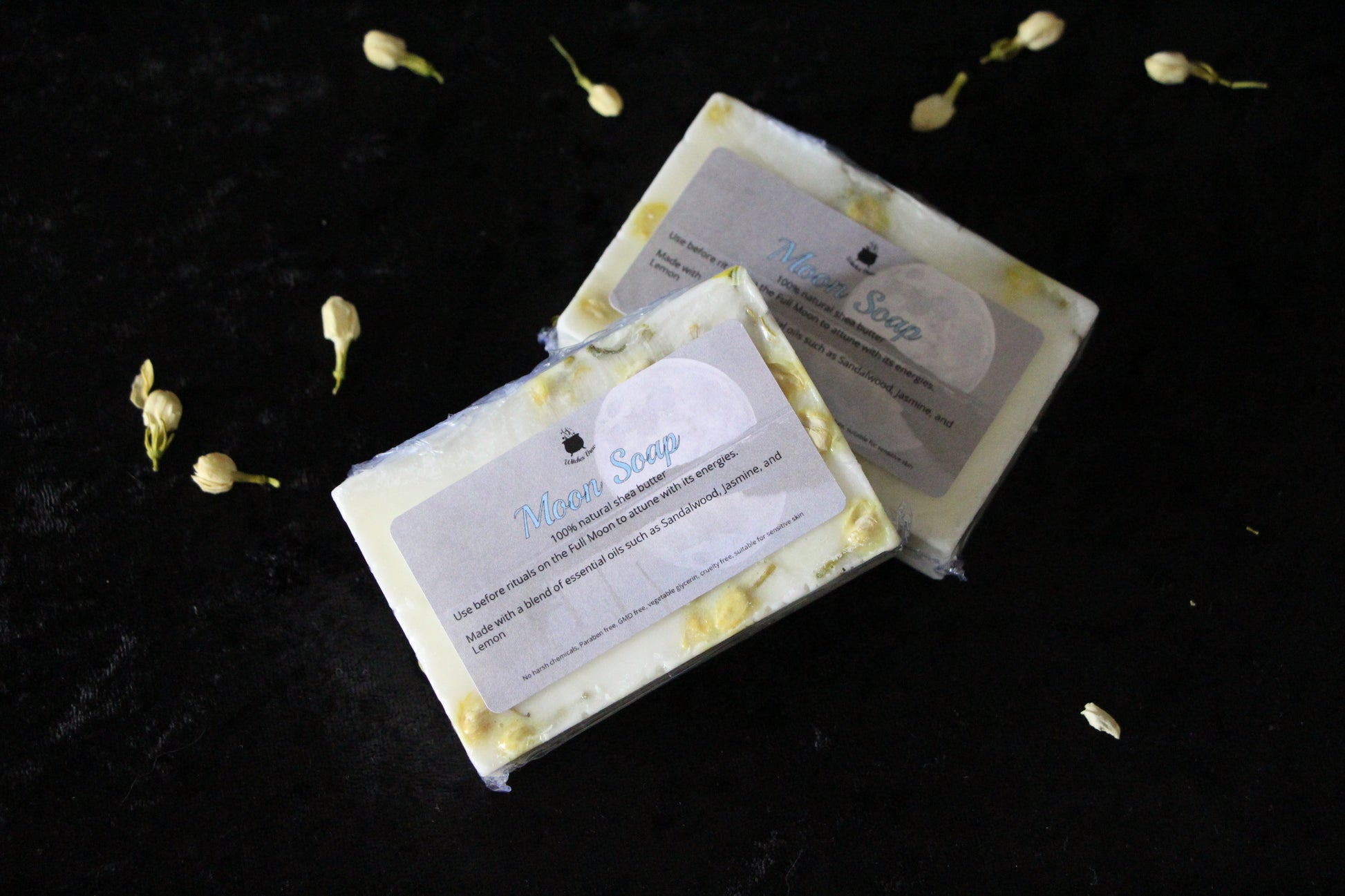 Description: Step into your sacred space with Moon Soap—a handcrafted, all-natural bar made with intention for spiritual cleansing and moon ritual preparation. Infused with the magic of lemongrass, sandalwood, and jasmine essential oils, and topped with dried jasmine flowers, this soap is both a spiritual tool and a self-care essential. Created with a nourishing shea butter base, it’s gentle enough for sensitive skin, yet powerful enough to clear stagnant energy and set the tone for transformation.